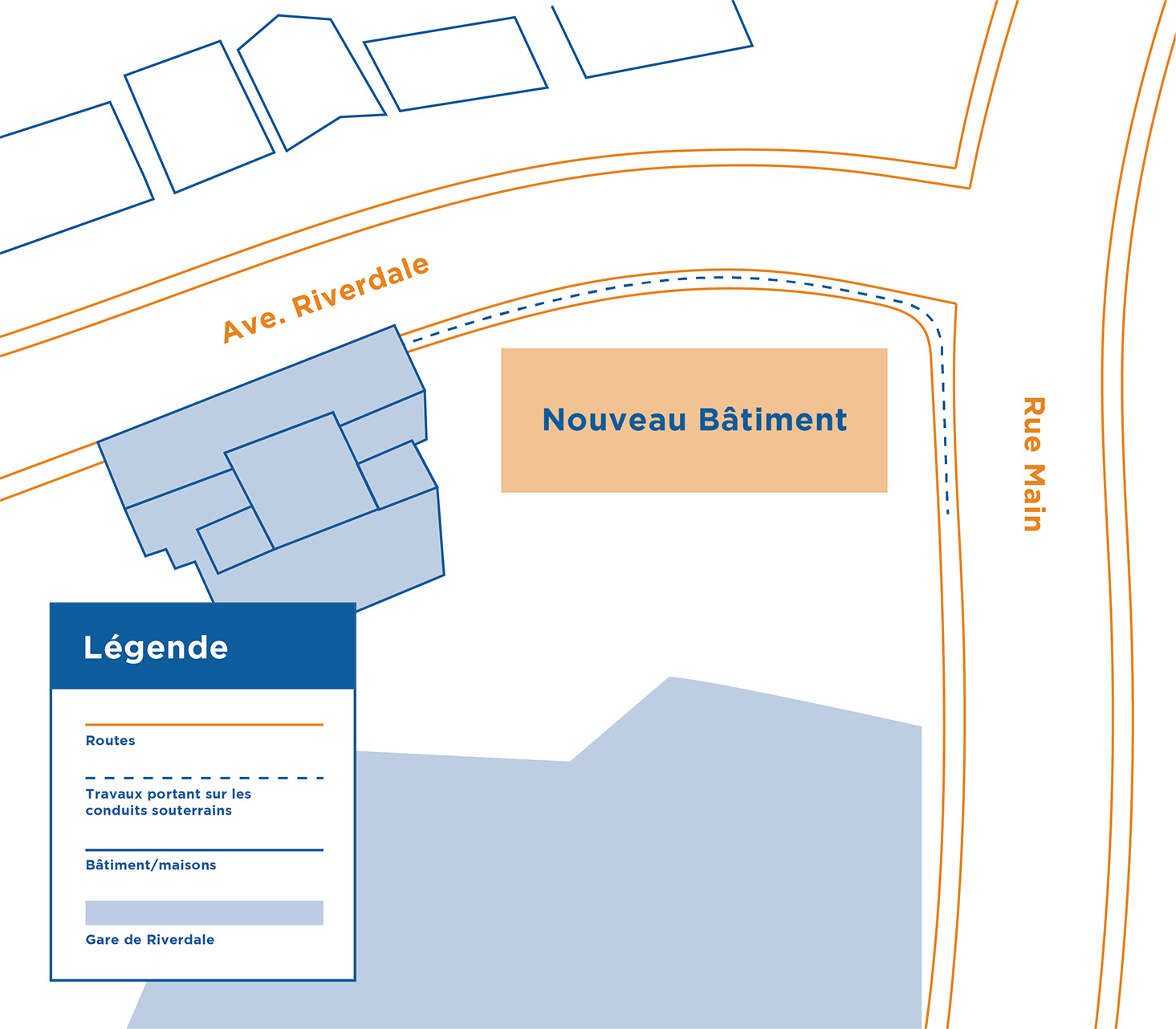 Un nouveau bâtiment fait de briques et de mortier sera construit à côté de l’actuel poste Riverdale, à l’intersection de l’avenue Riverdale et de la rue Main. Il abritera du matériel électrique essentiel, notamment des commutateurs, des fusibles et des disjoncteurs. Nous installerons également une infrastructure électrique souterraine en dessous du trottoir longeant le côté nord du périmètre du terrain.
