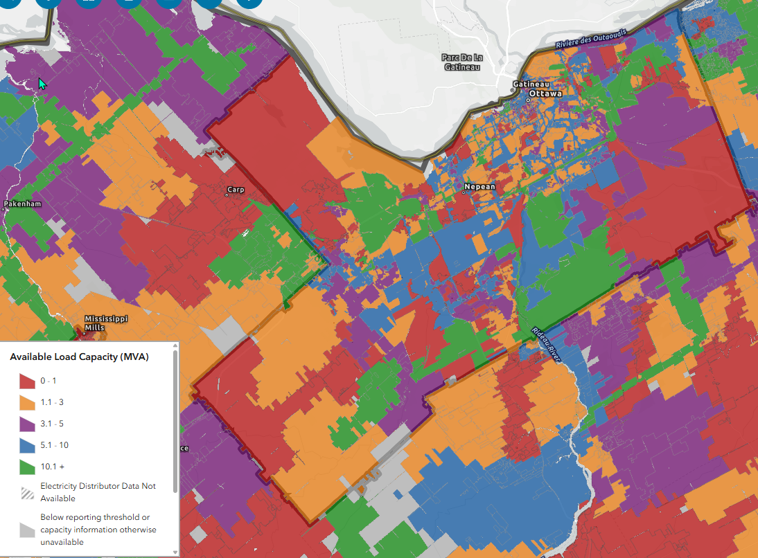 La carte centralisée de renseignements sur la capacité est fournie uniquement à des fins de référence générale et ne fait aucunement partie du processus de raccordement des RED d’Hydro Ottawa. Les clients qui souhaitent vérifier la capacité d’accueil des RED doivent se conformer au processus de raccordement normalisé d’Hydro Ottawa.