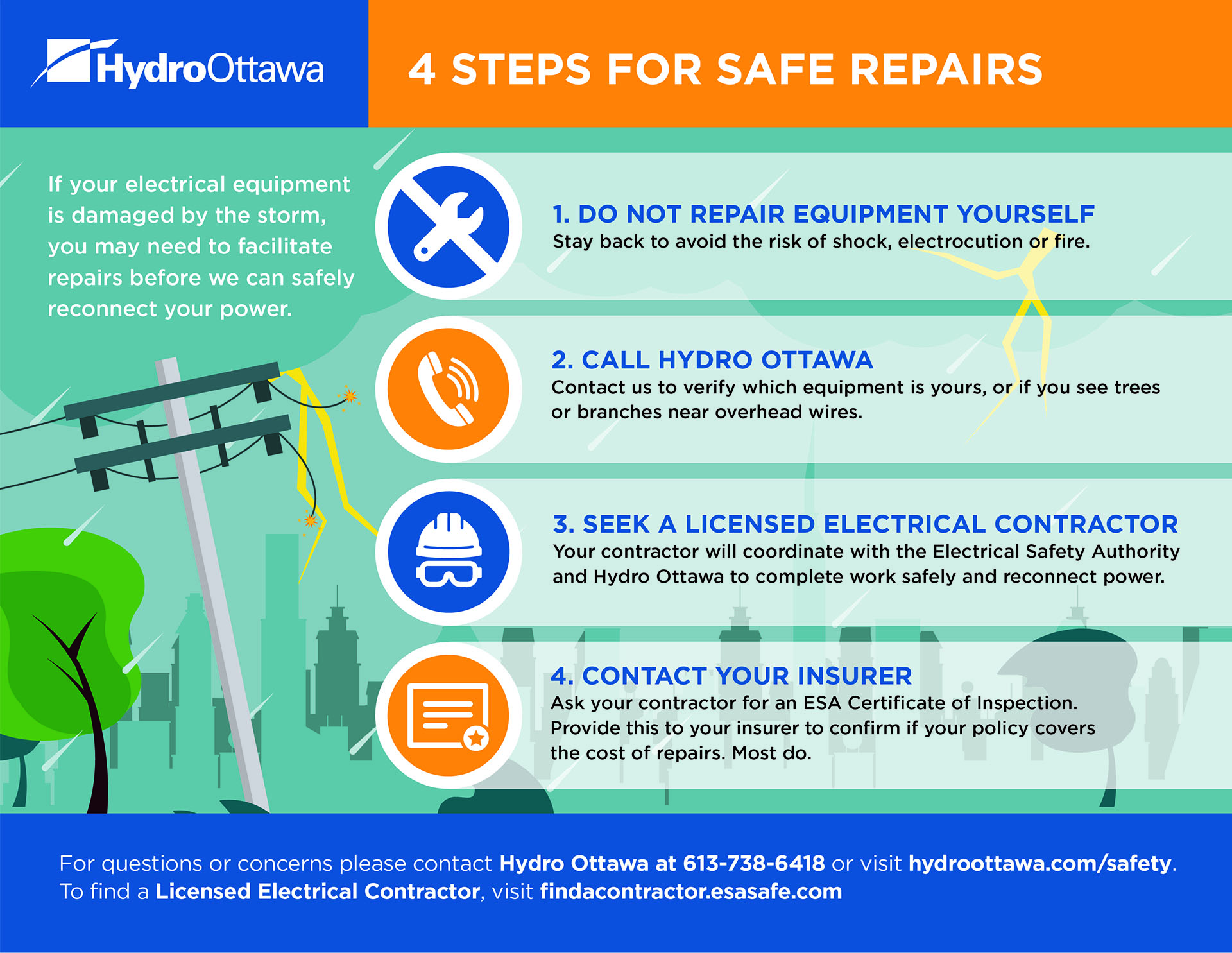 Temporary repairs: In some cases, we can reconnect your power after a licensed contractor completes temporary repairs authorized by the ESA. However, the repairs must be made permanent within 30 days. Insurance: Many home insurance policies cover repairs to your electrical mast. Ask your insurance provider about your coverage and keep all receipts related to your claim. Ask your contractor for a copy of the ESA Certificate of Inspection for your records. | ![]() | |